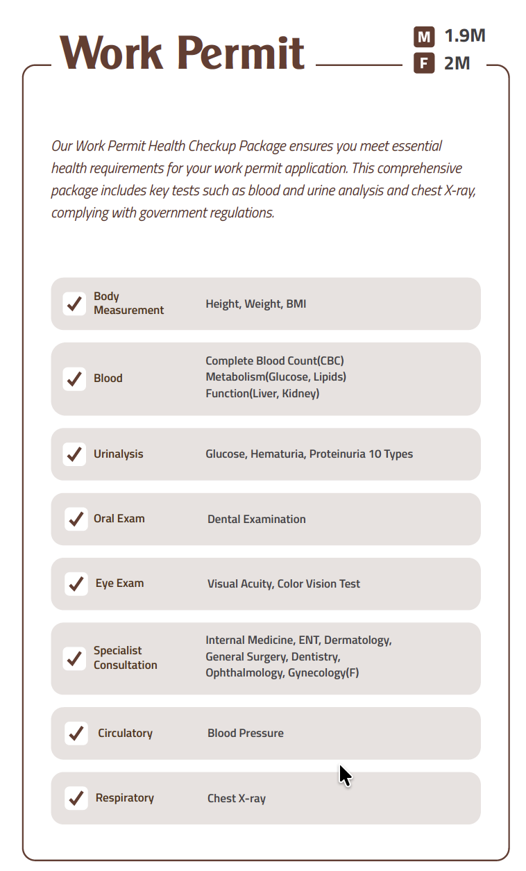 The Work Permit Check-up Package helps meet health requirements set by the government, including blood tests, urine tests, and chest X-ray.